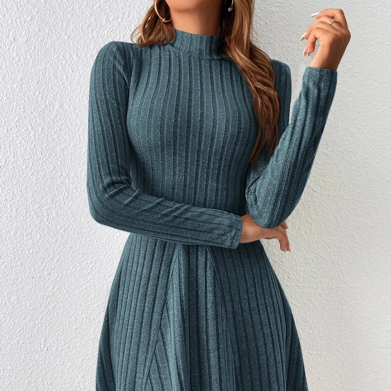 Feel the graceful flow of this sweater dress, designed with a ribbed texture and flared hem for a relaxed feel. Its refined mock neck and stretchable fabric add a touch of seasonal elegance.